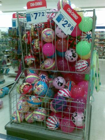 A local shop had this display of balls for sale. I overheard a mother with her young daughter, as the girl was choosing a ball for herself. When the girl selected a ball with a car on it, the mother told her it was a “boy’s ball” because it had a car on it. She was also strongly discouraged from selecting the ball with Spiderman too: “That ball has Spiderman on it. Do you really want that? It’s a boy’s ball”