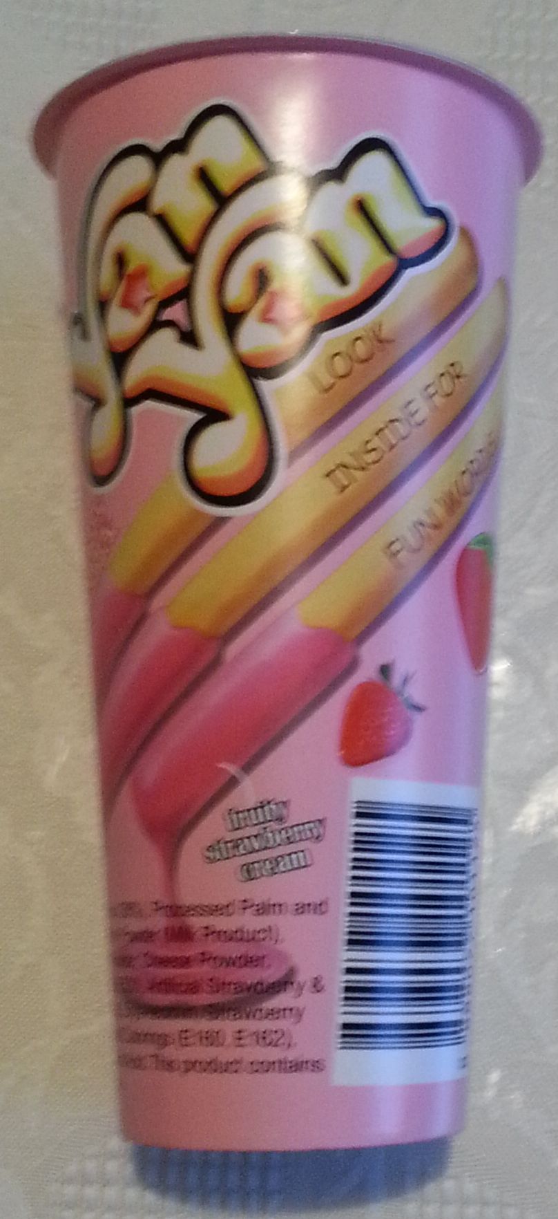 I popped in to one of the local Asian grocery stores today, and purchased something called “Yam Yam” – they are little breadlike sticks with a sweet dipping goo. They come in several flavours; I bought strawberry.